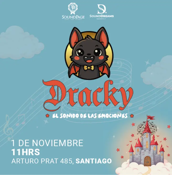 Con la hipnótica música de Philip Glass, interpretada por el Sound Dreams Quartet, DRACKY invita a los niños y niñas a aprender a escuchar lo que sienten, reconociendo a través del sonido emociones como la alegría, el miedo, la tristeza y la esperanza. Guiados por Dracky, un pequeño murciélago curioso y sensible, los asistentes se sumergen en una experiencia que combina narración en vivo, iluminación envolvente y arte visual, convirtiendo la música en un espejo de las emociones.